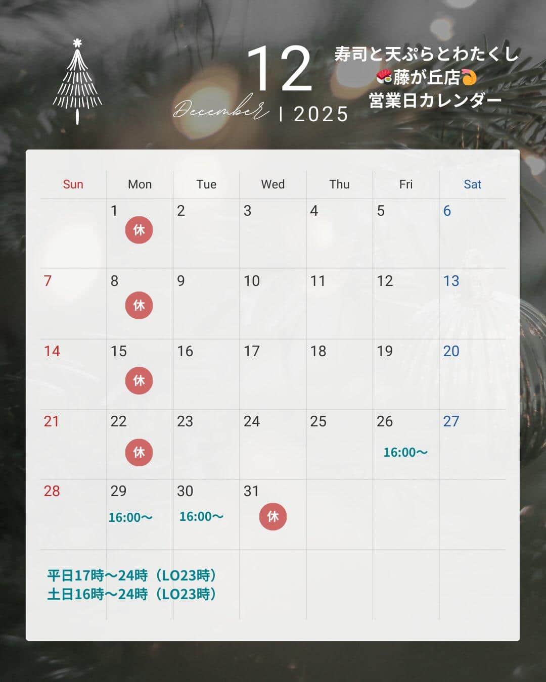 ※12月31日・1月1日は定休日となります。