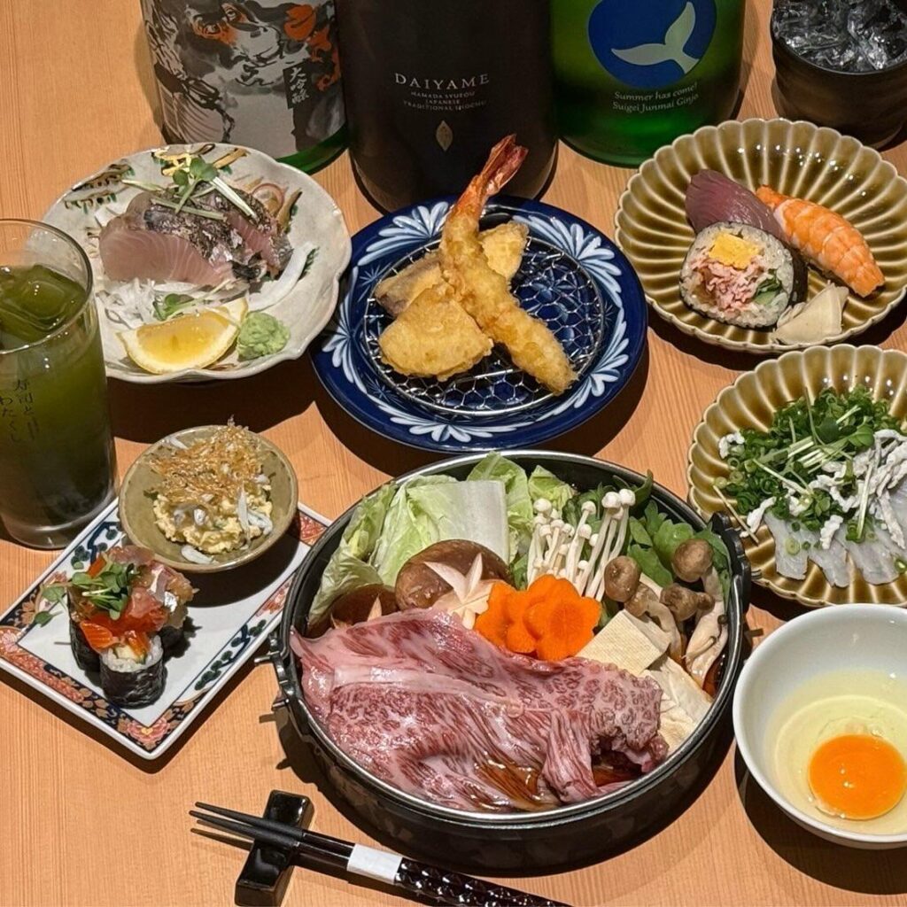 鮮魚、寿司、天ぷら、メインには黒毛和牛のすき焼き鍋が楽しめる贅沢なコースとなっております。飲み放題も90分ついているので会社宴会や飲み会、新年会、同窓会、歓迎会、送別会などにぜひご利用ください。