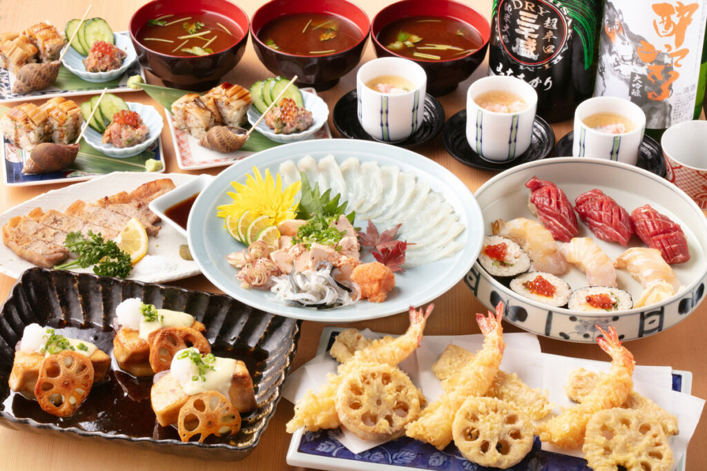 旬の鮮魚特上の握り寿司、厳選したの天麩羅、旬の蛤と大根の酒蒸しも堪能していただける上質なコースとなっております。飲み放題も付いております。会社宴会や飲み会、歓迎会、送別会、接待、同窓会、特別な記念日にぜひご利用ください。※コース写真はイメージです。