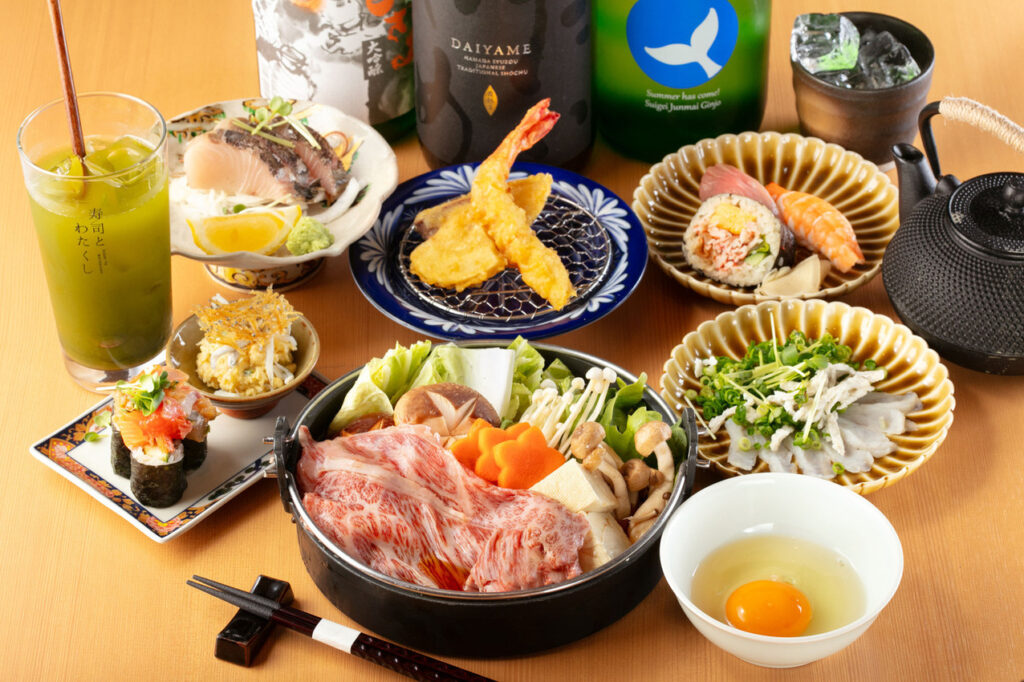 鮮魚、寿司、天ぷら、メインには黒毛和牛のすき焼き鍋が楽しめる贅沢なコースとなっております。飲み放題も90分ついているので会社宴会や飲み会、同窓会、歓迎会、送別会などにぜひご利用ください。