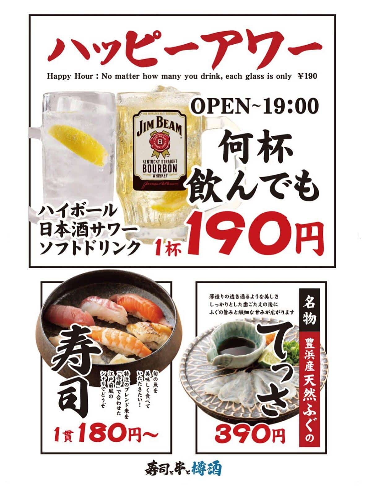 日〜金の19:00までは、ハイボール・日本酒サワー・ソフトドリンクが何杯飲んでも1杯190円〈栄居酒屋/栄寿司酒場〉