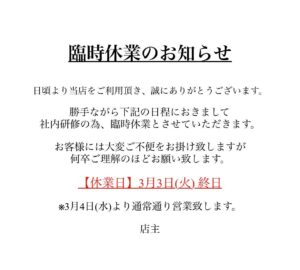 ⚠️3月3日(火)休業のお知らせ⚠️