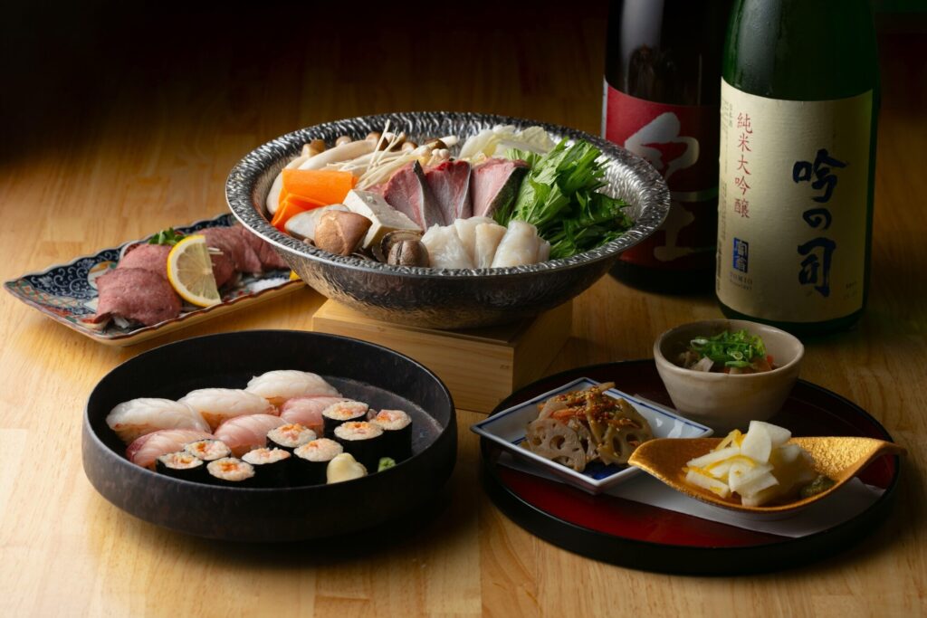 前菜からはじまり、旬のお造りや串揚げ、握り寿司。メインには桜鯛のしゃぶしゃぶ鍋が愉しめるコースです。