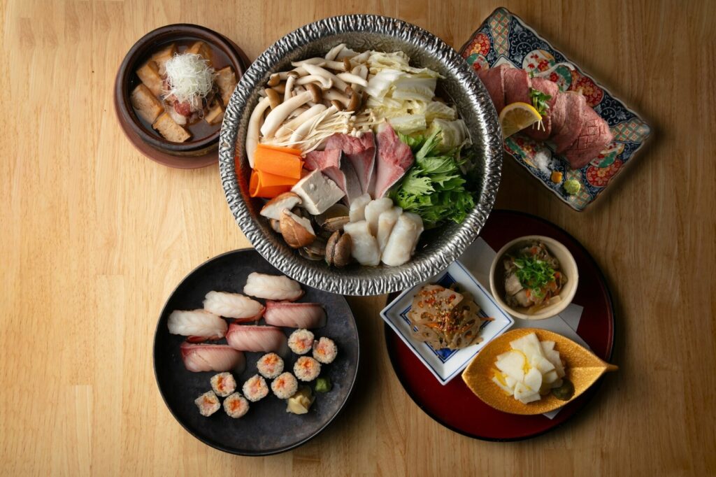 前菜からはじまり、黒毛和牛と京水菜のハリハリ鍋や串揚げに握り寿司も愉しめる満足コース。
