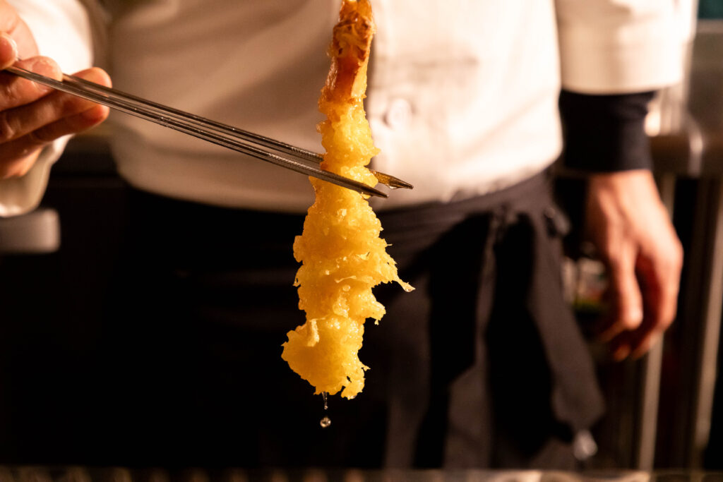 米粉をブレンドして揚げるサクサク天ぷら。市場直送の⾷材を使⽤した王道の天ぷらメニューに加え、ちょっと変わった創作天ぷらもお酒と⼀緒についつい頼みたくなる逸品ばかり。お寿司のお供に、天ぷら料理はいかがでしょうか